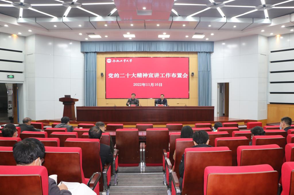 為高質量做好黨的二十大精神宣講工作,切實推動黨的二十大精神往深里走、往心里走、往實里走,11月16日,學校召開學習貫徹黨的二十大精神宣講工作布置會,校黨委書記、學習貫徹黨的二十大精神學校宣講團團長余其俊出席會議并講話。校黨委副書記、宣講團副團長陳鴻海主持會議。