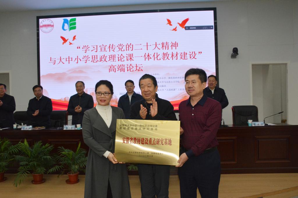在隨后舉行的安徽省大中小學一體化思政理論課教材建設重點研究基地揭牌儀式上,儲常連為基地授牌,我校馬克思主義學院院長牛小俠和安徽教育出版社社長費世平共同為基地揭牌。
