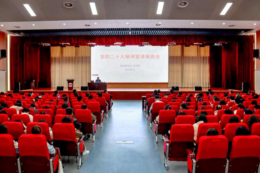 2月28日,校黨委書記余其俊在翡翠湖校區科教樓二樓報告廳宣講黨的二十大精神,報告會在宣城校區設視頻分會場,食品與生物工程學院全體教工、宣城校區全體學生政工干部、學生代表等1000余名師生參會。