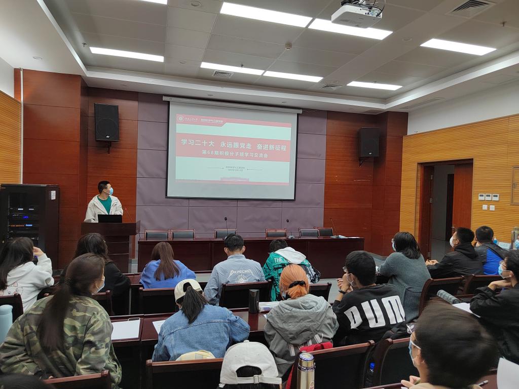 10月19日晚,材料科學與工程學院于翡翠湖校區科教樓第五會議室舉行“學習二十大 永遠跟黨走 奮進新征程”第68期積極分子班學習交流會,交流會同時在屯溪路校區材料樓601會議室設立分會場。會議由學員代表顏德紀主持,全體學員參加了此次會議。
