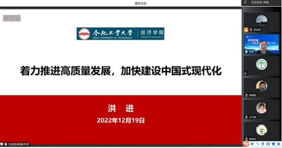 洪進教授從新時代新征程中國共產黨的使命任務引入,重點闡述了著力推進高質量發展、貫徹新發展理念、加快建設中國式現代化三方面的內容,他引用馬克思歷史唯物主義和剩余價值兩個發現,指出在新形勢下發展經濟的重要意義,闡述了高質量發展是全面建設社會主義現代化國家的首要任務,介紹了新發展理念的豐富內涵,重點介紹了創新在經濟發展中的核心地位和戰略價值,最后介紹了中國式現代化的豐富內涵。