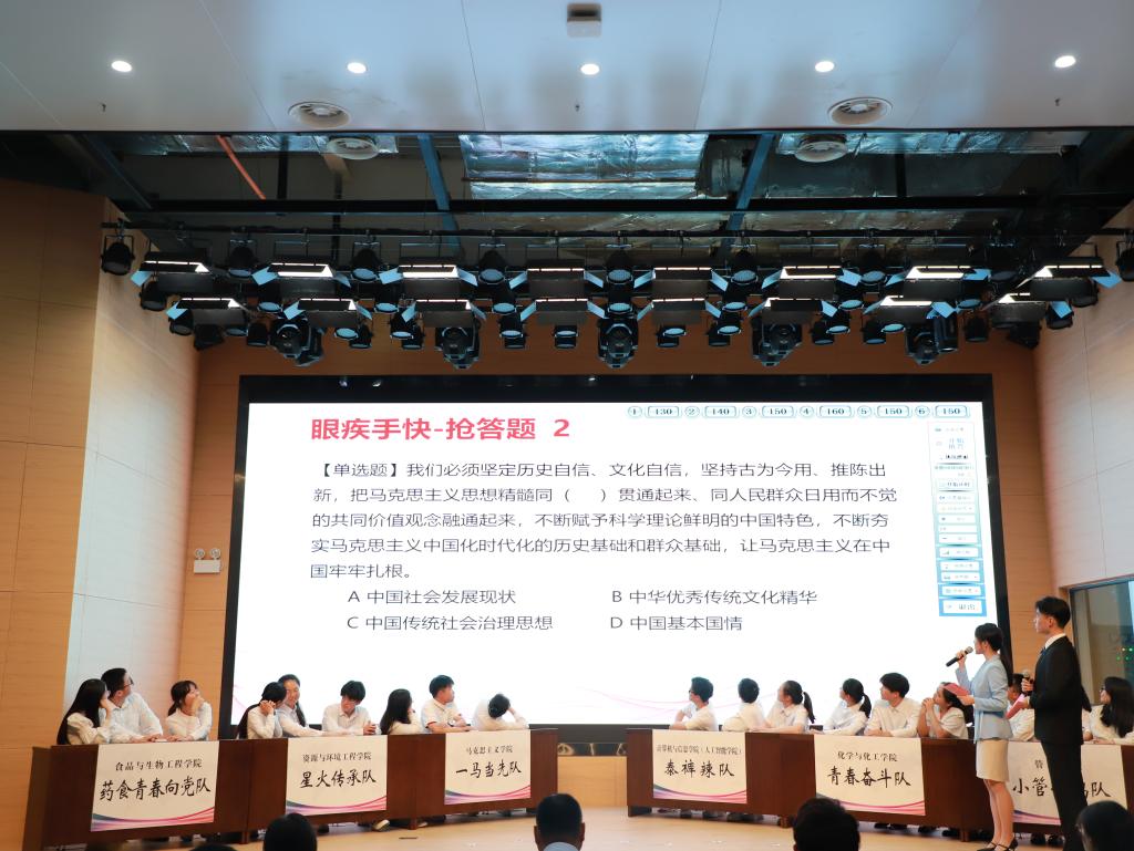 決賽設置先聲奪人、眼疾手快、誰與爭鋒三個環節,圍繞黨的二十大報告、黨史光輝歷程等內容,通過必答題、搶答題、pk賽進行展示。答題環節,6支隊伍反應迅速、分秒必爭,現場親友團加油助威,掌聲不斷、呼聲不停。互動環節,現場觀眾競相參與,答題積極。經過激烈角逐,馬克思主義學院代表隊奪得一等獎,化學與化工學院代表隊、管理學院代表隊榮獲二等獎,資源與環境工程學院代表隊、食品與生物工程學院代表隊、計算機與信息學院(人工智能學院)代表隊榮獲三等獎。